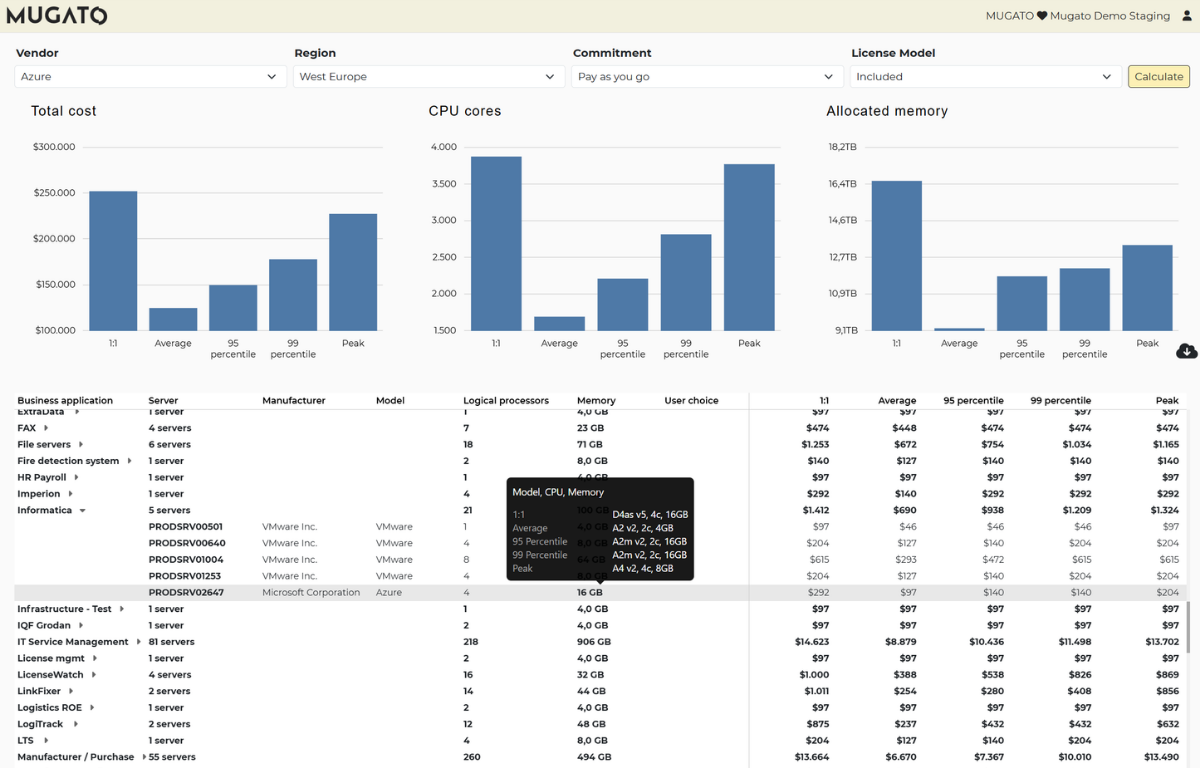 Go beyond compute metrics. Mugato evaluates each service across compute, technical debt, cybersecurity, licensing, management, hardware and consolidation.