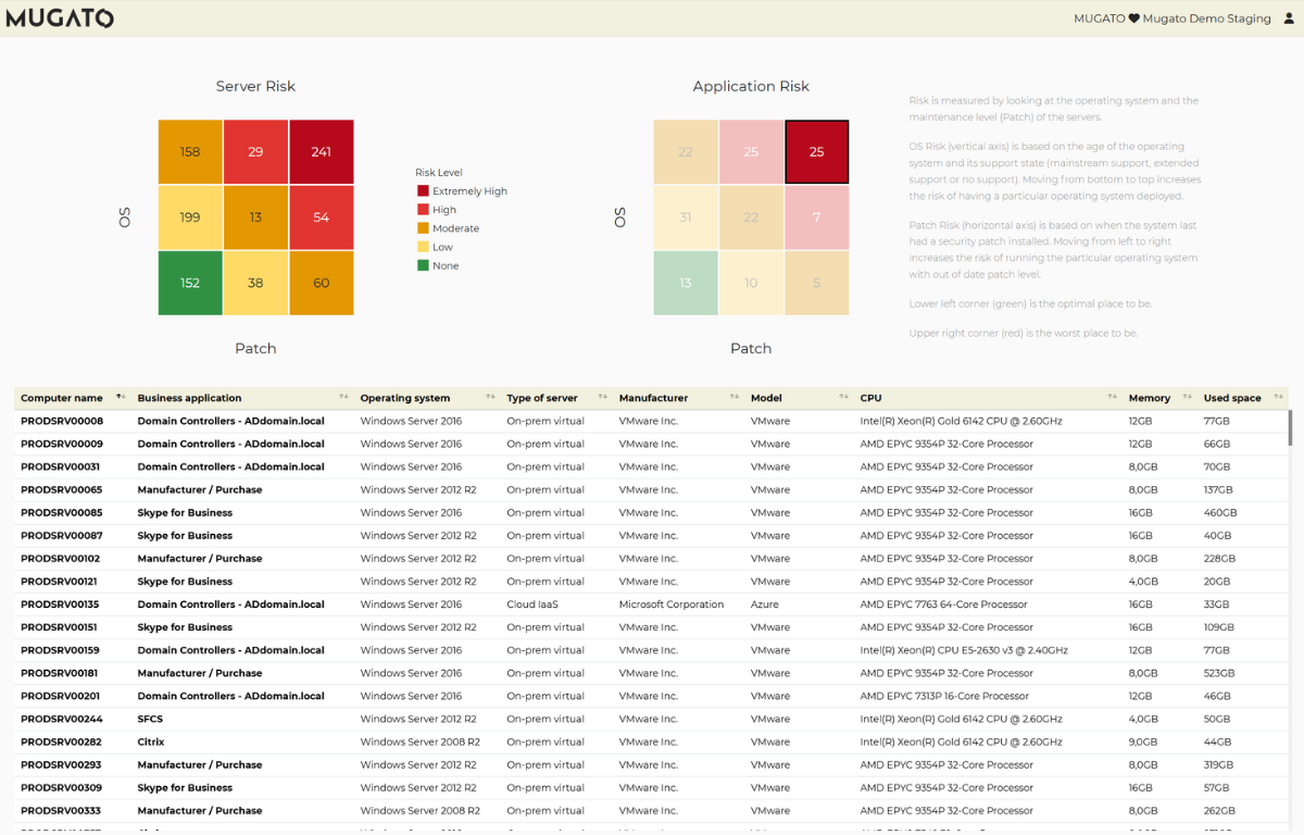 Go beyond simple CPU and memory metrics. Mugato evaluates each application service across seven dimensions: compute use, technical debt, cybersecurity posture, licensing exposure, management overhead, hardware age and consolidation opportunity.