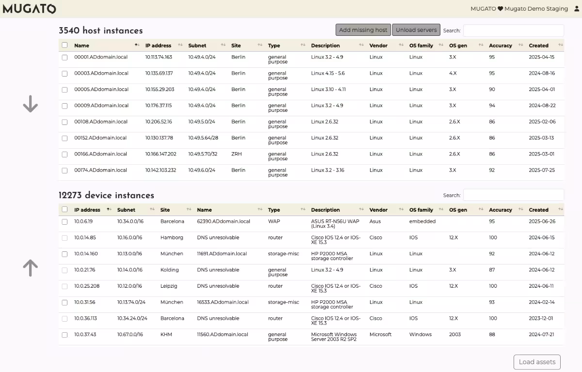Mugato automatically discovers every device and connection across your environment, without agents or network disruption. Discovery runs daily, targeting only unknown areas, so your inventory grows continuously as new devices appear.
