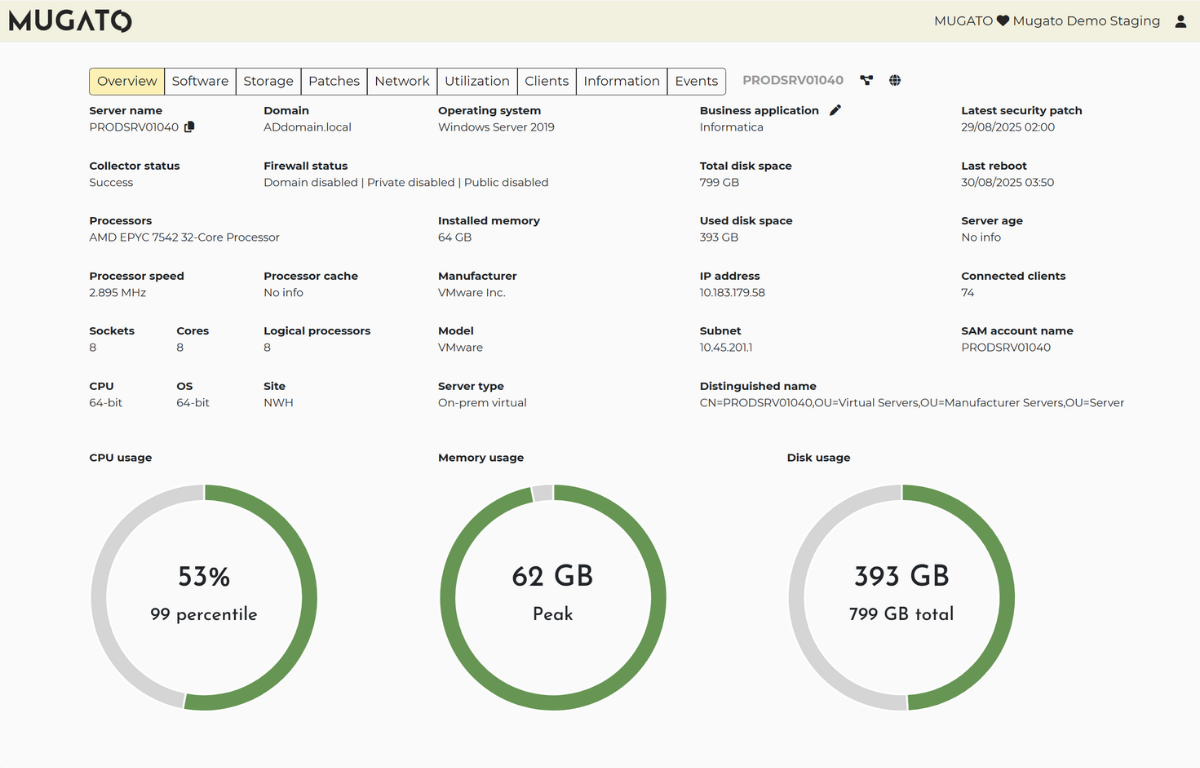 Thirty-minute installation. Two weeks for the Mugato software to process mine and compute. No manual workload aside from a few finetuning tasks, usually a one-time setup time of two hours per 500 servers.